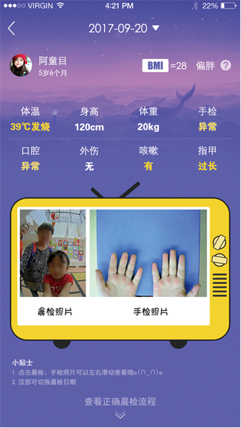 每天晨檢數據上傳云端,家長可通過APP查看數據。當入園體檢異常時,老師、家長都可第一時間發現,寶寶健康狀況能得到關注。也能有效避免其他兒童在幼兒園這樣的集體環境中受到流行性疾病的感染。